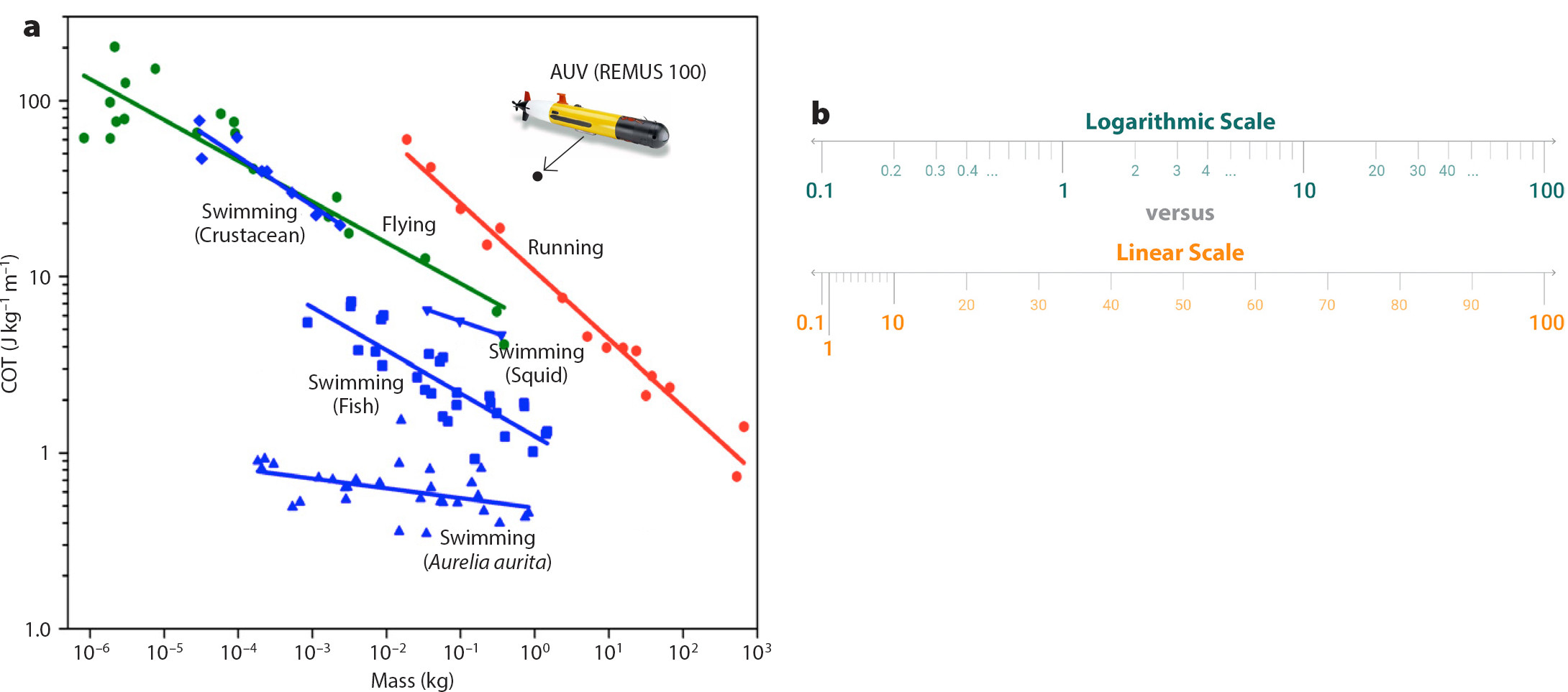 FIGURE 2. (a) Cost of transport (COT) versus mass for a variety of animals (colored by mode of locomotion, with pond in blue, flying in green, and running in blood-red) and a representative AUV (e.1000., REMUS 100). Note that both axes are scaled logarithmically, and as illustrated, Aurelia aurita jellyfish possess the lowest COT values equally the most energy efficient animals. Adjusted from Gemmell et al. (2013) (b) A schematic scale showing the difference between a logarithmic scale (light-green) versus a linear scale (orange), to highlight the disparity in the COT values in the top logarithmic plot. Adapted from Lisa C. Muth, Datawrapper. > High res figure